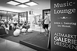 Es galt ein Live-Erlebnis zu schaffen, mit welchem die Altmarkt-Galerie Dresden ihre Position als zentraler Bestandteil des urbanen Erlebens einmal mehr unterstreichen kann. Da gerade Dresden untrennbar mit Musik verbunden ist, begaben wir uns auf die Suche nach Dresdner Musikern, welche zwar noch fernab der großen Bühnen agieren, aber dennoch oder gerade deshalb durch besondere Qualitäten überzeugen. An jedem ersten Samstag im Monat ist seit Juli einer dieser Künstler in der MUSIC-LOUNGE der Altmarkt-Galerie Dresden live zu erleben. Als fester Bestandteil des Konzeptes wurde eine Kooperation mit dem lokalen Stadtradio „Radio Dresden“ entwickelt. Dort findet die MUSIC-LOUNGE parallel on air statt und der jeweilige Künstler wird den Radiohörern vorgestellt. Um die Aktion ins rechte Licht zu rücken, installierten wir eine einladende Lounge im Obergeschoss der Altmarkt-Galerie Dresden und sorgten mit einem ferngesteuerten Zeppelin, Walking Acts, Hostessen und klassischen Tools für die Bewerbung der Konzerte