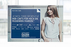 Für die Altmarkt-Galerie Dresden entwickelten wir einen inhaltlichen sowie auch gestalterischen Rahmen für einen ganz speziellen Modeherbst zum „Abgucken“. Dazu schlugen wir alte Bildbände großer Maler auf und ließen der Phantasie freien Lauf. So entstand die „Galerie der Mode“ mit 14 verschiedenen Ausstellungsflächen als inspirierende Verbindung der Kulturphänomene Mode und Kunst – und als logische Konsequenz ihrer Ähnlichkeit. Einladende Tore sowie eine ergänzende Plakat- und Anzeigenkampagne erzeugten die notwendige Aufmerksamkeit und das Interesse an dieser zweiwöchigen, sehr detaillierten Präsentation dieses hoch frequentierten Modestandortes in der Dresdner Innenstadt.